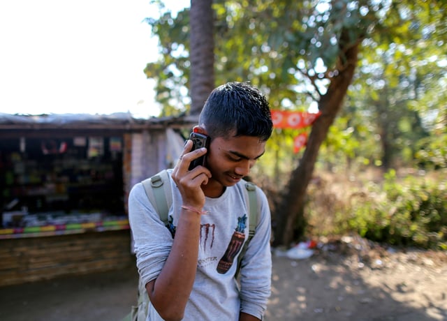 A man uses his mobile phone at a store on Dahanu Road in Kainad, Maharashtra, India. (Photographer: Dhiraj Singh/Bloomberg)